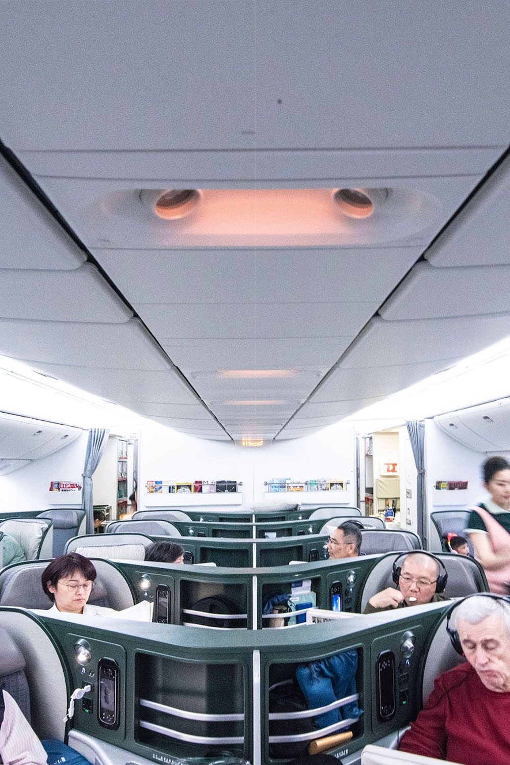I can’t lie: The 787 cabin is beautiful, with dark and metallic finishes that create a moody atmosphere, which manages to suit both the lack of light on long haul, nighttime flights to North America, and the bright sunshine that permeates services within Asia, and many of the ones to Europe. By contrast, the 777 cabin feels dated and even retro, with a mix of beige, gray and green you might even describe as gaudy.